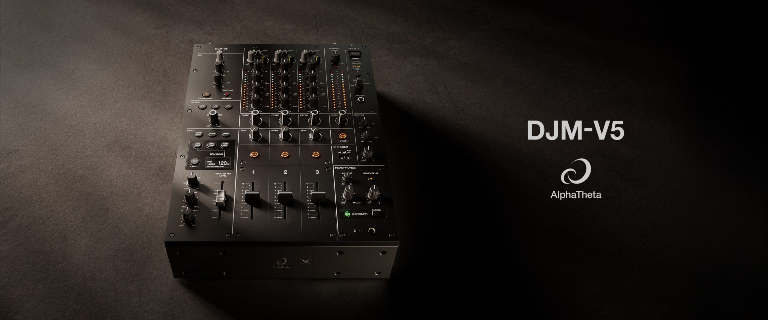 AlphaTheta has released the DJM-V5, a compact 3-channel DJ mixer built on the sound architecture of the DJM-V10, bringing flagship-style sound shaping into a smaller format. Available late January 2026 with a MAP of $2,199 USD, the V5 includes 4-band EQ and channel compression on every channel, per-channel Send FX, multi-mode filters, 96 kHz / 64-bit DSP, and ESS 32-bit A/D and D/A converters on key signal paths. It also adds a new cross-pass filter for shaping mids and highs without cutting low end, plus built-in SonicLink wireless headphone monitoring.